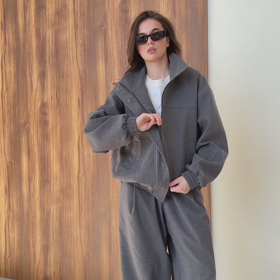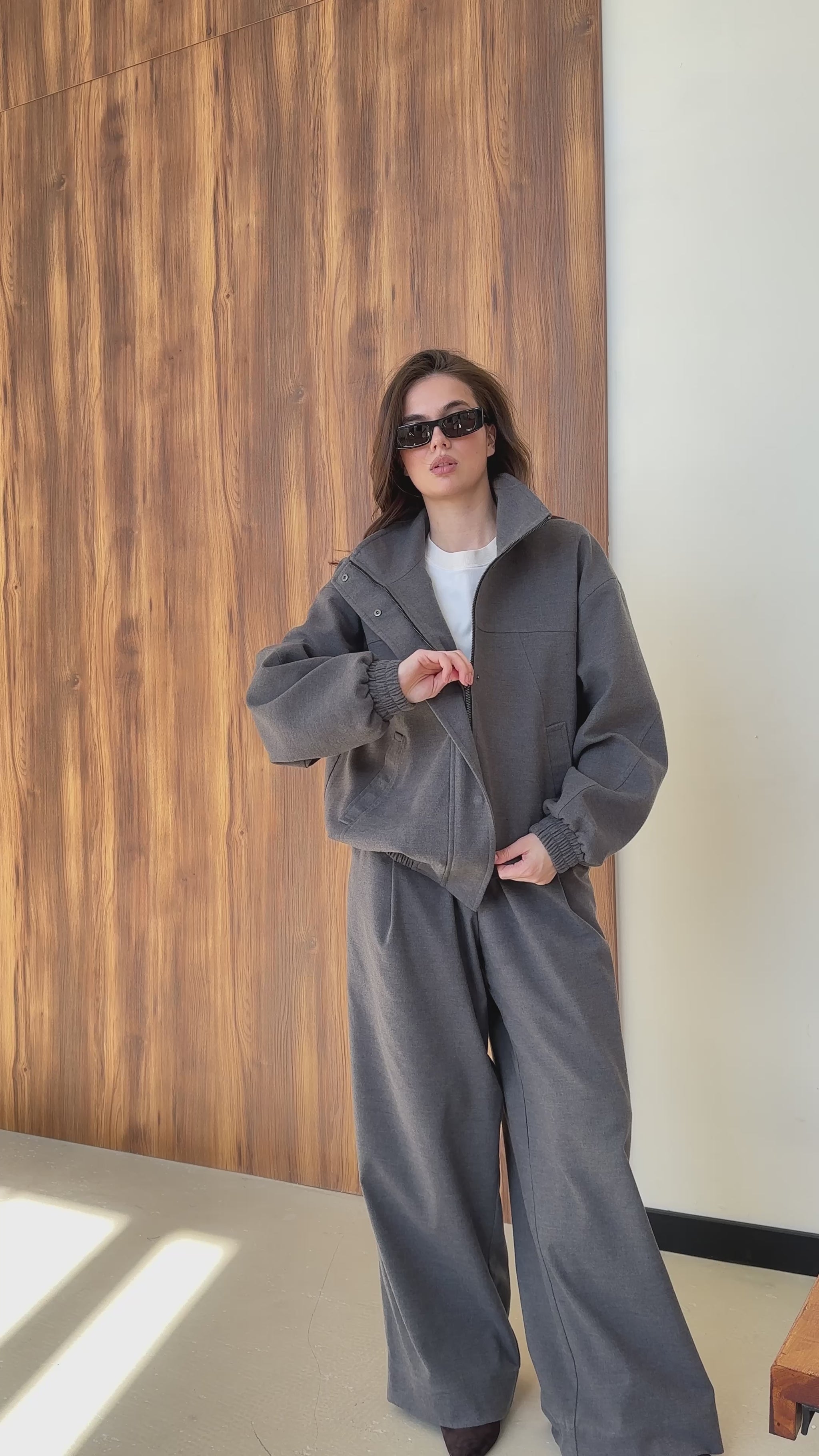 Об’ємний бомбер, виконаний із м’якої вовняної тканини. Модель має занижену лінію плеча, відкладний комір-стойку та застібку на блискавку з додатковими кнопками. Передні кишені інтегровані у шви для збереження лаконічного вигляду.