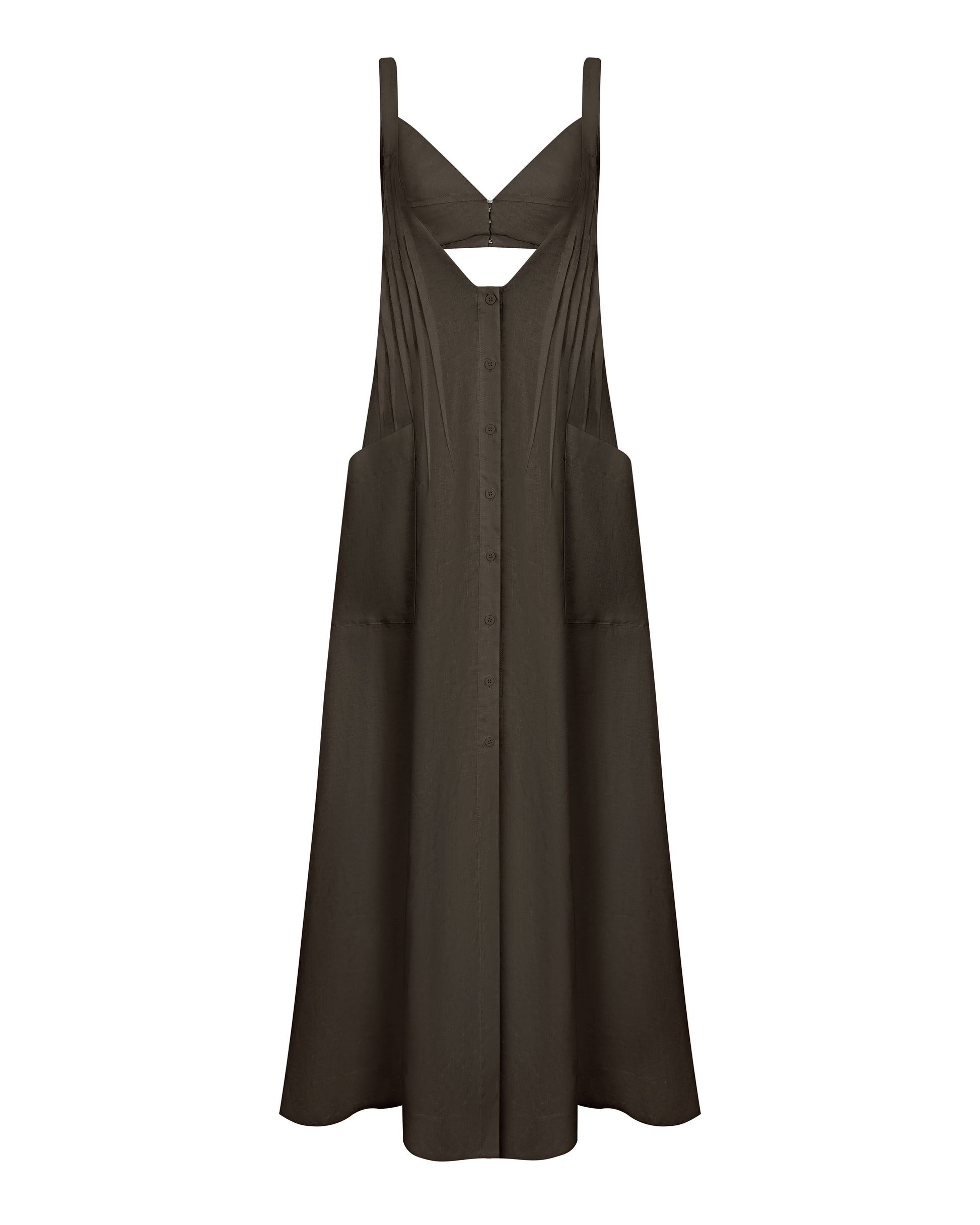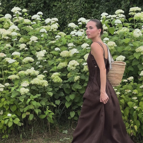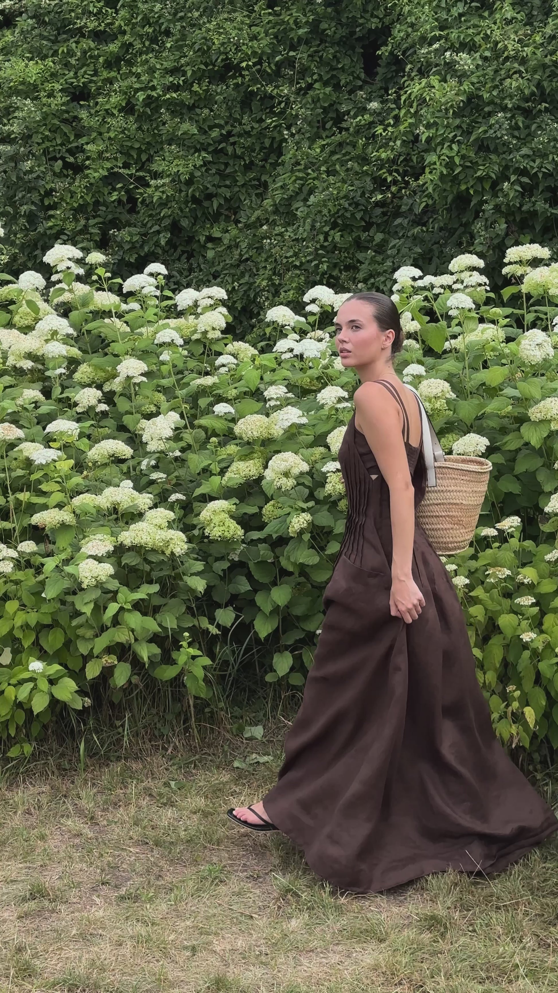 A linen sundress with a top with stretch elastic for a comfortable fit and draped at the waist in maxi length reflects tenderness and elegance.