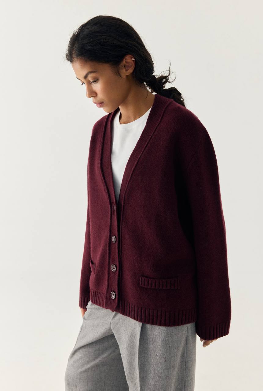 A classic straight-cut cardigan made of soft premium quality knitted yarn. The model has a V-neck, button fastening and decorative imitation pockets. The bottom of the product and cuffs are decorated with elastic rubber.